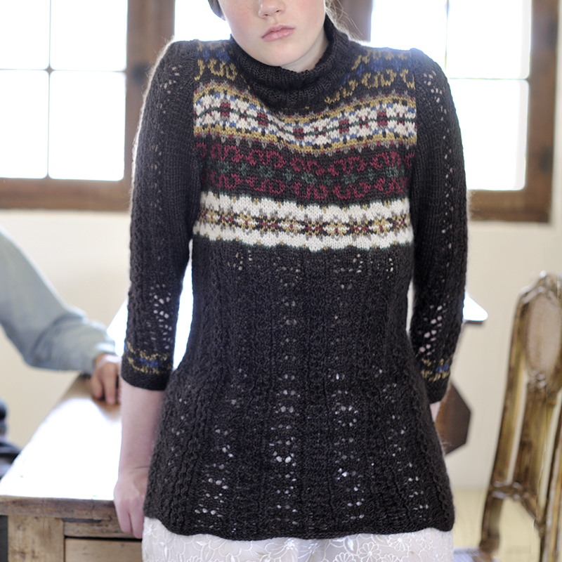 フェアアイル模様にレーシーな透かし模様を合わせたハイブリットなデザイン。長め丈のシルエットも、フェミニンで優雅です。絶妙な配色で、良く見れば納得のさりげないペア感も素敵。