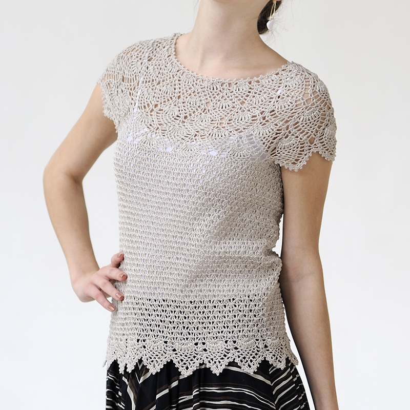 衿ぐりから作り目をして編むパイナップルヨークのプルオーバーは、とじはぎなしでやさしく編みあげられるのが魅力です。透け感の美しい袖崎や裾のスカラップが華やか。