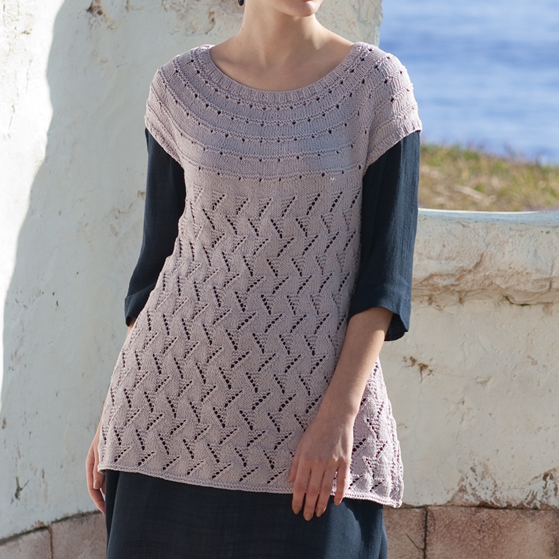ラベンダーカラーのチュニック丈の丸ヨークプルオーバー。ワンピースを重ねた大人かわいいレイヤードスタイルが新鮮です。