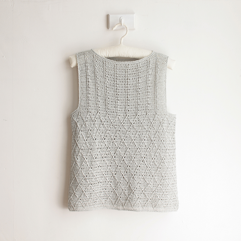 引き上げ編みを効果的に配置したベストです。胸元の切り替えの下はダイヤ柄のように、上は縦のラインでとシンプルながらも表情のある作品です。