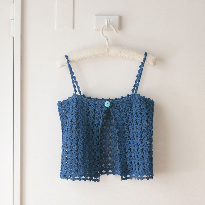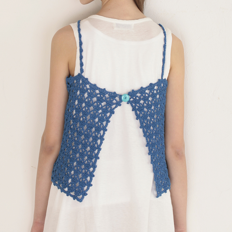 ブルーが綺麗な後ろ開きのキャミソールです。ひとつだけちょこんと付いたボタンと繊細な肩ひもが可愛らしい作品です。