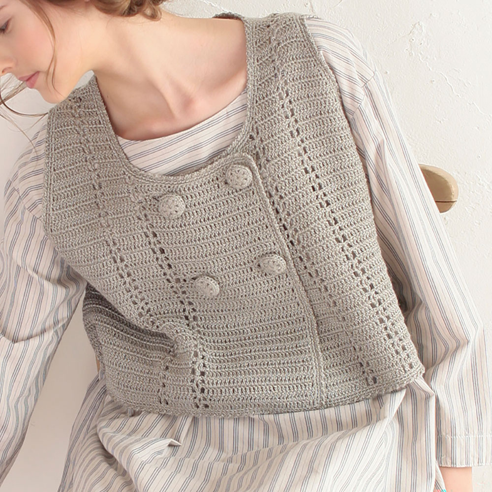 ダブル開き、4つのくるみボタンが印象的なベストです。身頃はゆったりとしたシルエットになっているので気心地も快適です。
