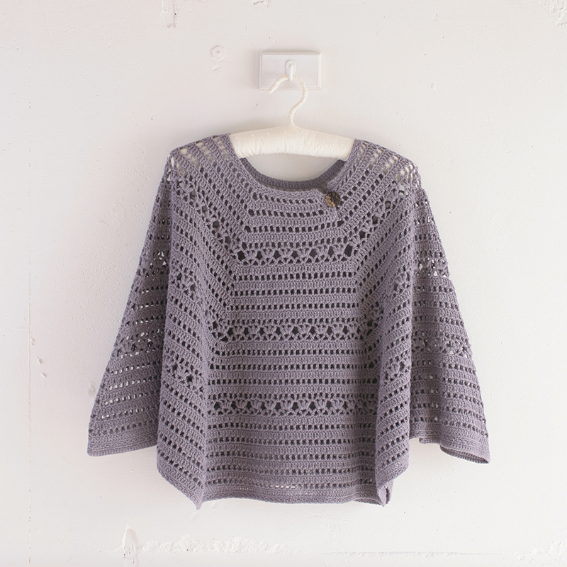 前衿ぐりのスリットとボタンがポイントのポンチョです。袖口がついているので動きやすく、パープルカラーにも心が弾む作品です。