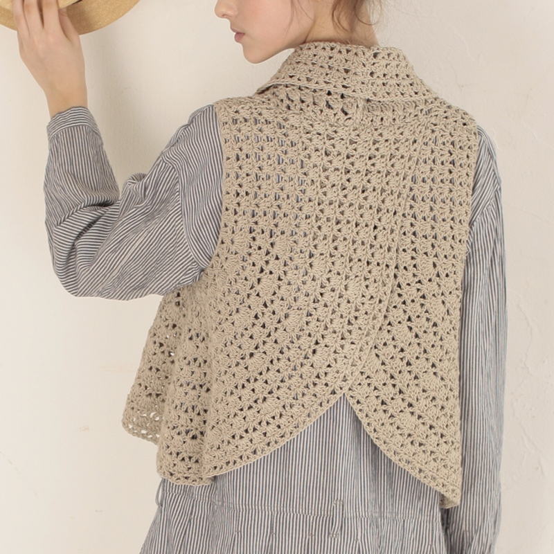斬新なデザインのヘチマカラーのベストです。ですが、U字のパーツ2枚編むだけなので、ぜひチャレンジしてみたい作品です。