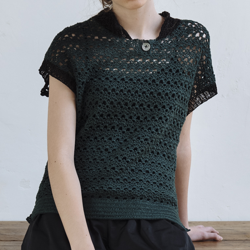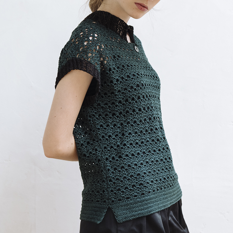 小さな衿が存在感を発揮する、ドロップショルダーのポロセーター。 身頃はかぎ針編み模様を、衿と袖口は棒針で2目ゴム編みを編みます。深い緑×黒のクールカラーがスタイリッシュな印象に。