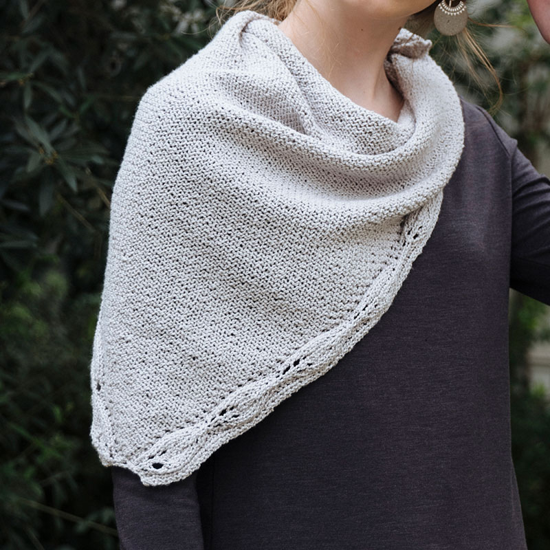 使いやすい大判の三角ショールは、ふんわりと軽いファンシーヤーンで編みます。ベースは裏メリヤス編み、両サイドにアレンジした木の葉模様との境で増し目をしていきます。