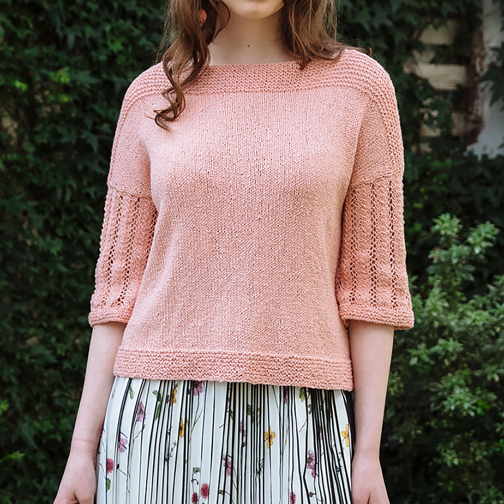 袖のレース模様が涼やかな、ボートネックのサマーセーター。ゆるやかにウエーブするファンシーヤーンの形状と、可憐なソフトピンクがロマンチックな印象です。