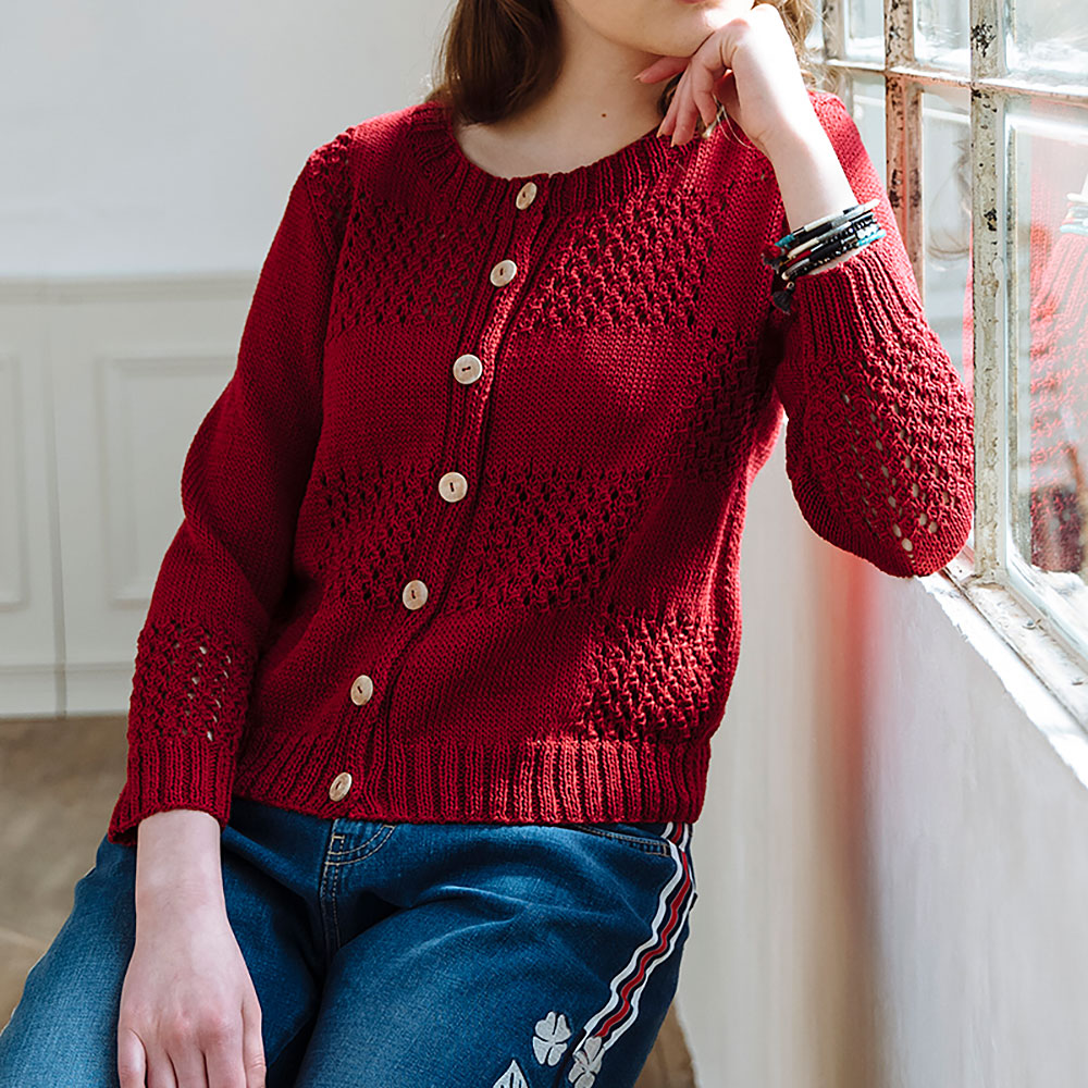 透かし編みのノット模様とメリヤス編みをブロック状に配した、パッチワーク柄のカーディガン。後ろ身頃はメリヤス編みです。スパイシーな“赤”が、カジュアルな装いを引き立てます。