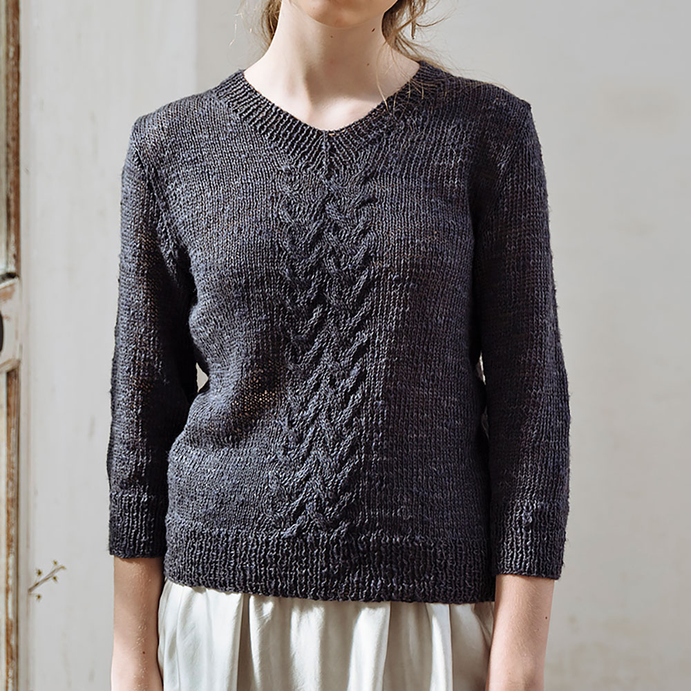 サラッとした手触りが気持ちのよい、1 枚で着られる浅いVネックのケーブル柄セーター。かすれたようなニュアンスのある黒の濃淡が、どこか素朴な雰囲気です。
