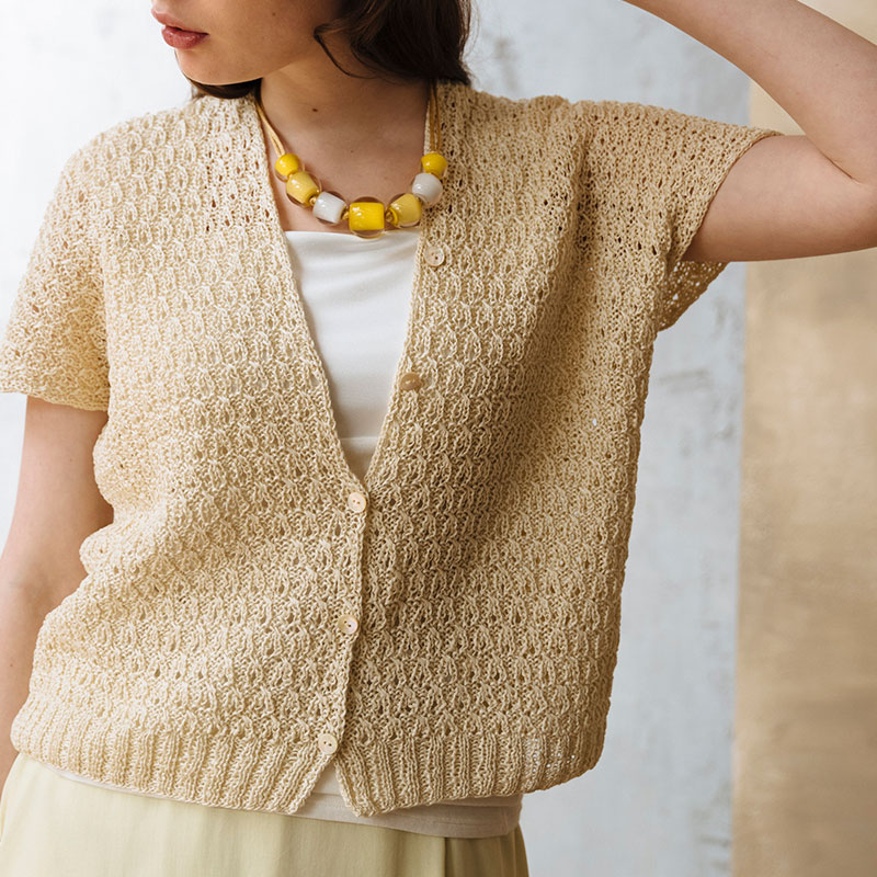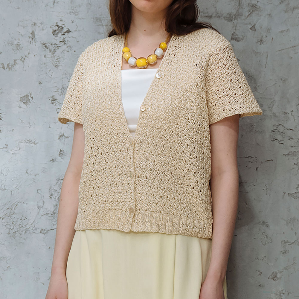 しずく模様が可愛らしいドロップショルダーのカーディガン。やわらかなクリーム色が、心地よい春の気分にぴったり。後ろは編み終わりを分けて編んで、衿あきにします。