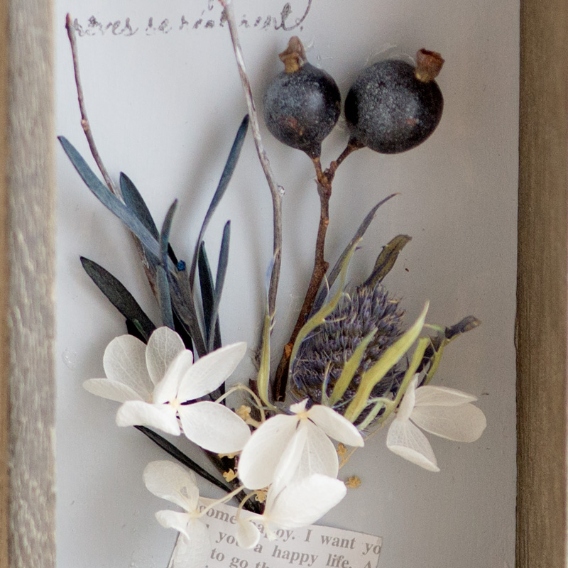長方形のウッドフレームに、ドライフラワーやプリザーブドフラワーをアレンジできるキットです。必要な材料と詳しいレシピがセットされているので、すぐに制作を始められます。