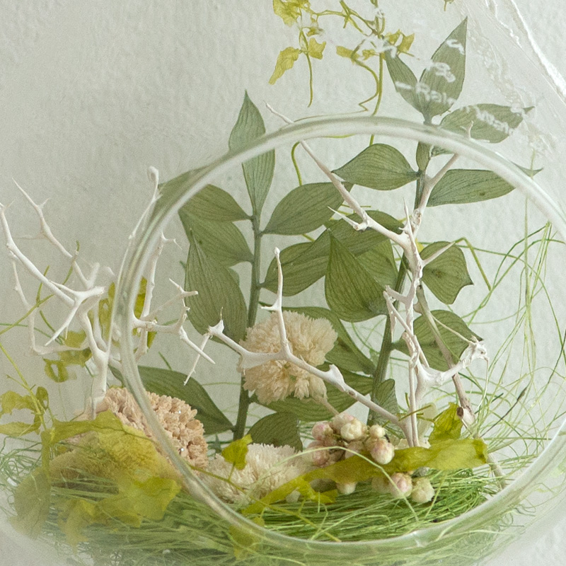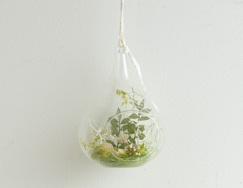 ガラス製のハンギングベースに、ドライフラワーやプリザーブドフラワーをアレンジするキットです。必要な材料と詳しいレシピがセットされているので、すぐに制作を始められます。