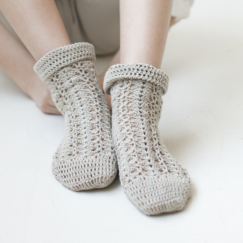 ざっくりした麻糸でさくさく編んだ、松編みのソックスです。つま先とかかとはシンプルな長編みです。