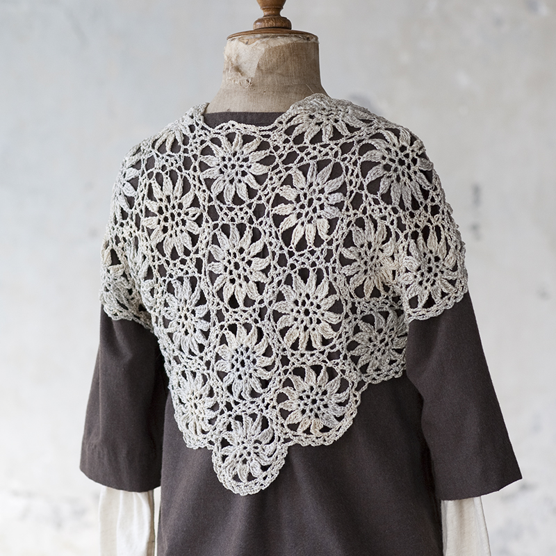 しなやかなシルクヤーンは段染めの繊細さがとてもマッチ。普通にモチーフを編むだけで、まるで複雑に計算したかのような発色におどろきます。大輪のお花は遠くから見ると浮き出て、すぐにあなただとわかります。