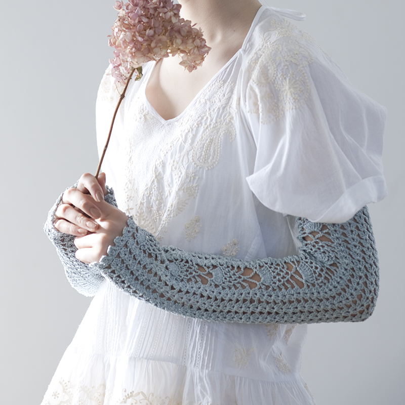せっかく編むのだから、素肌につけるアイテムはなめらかな糸を選びましょう。シルクが持つニュアンスのあるブルーがぴったり。縦に並べたパイナップルが自慢の1組です。春夏は日傘と合わせれば日焼け防止はばっちり、秋冬は手首まで下ろしてハンドウォーマーに。