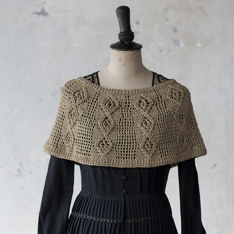 ケープにも、スヌードにもツーウエイで着られる、便利なアイテムです。台や柄の大きさは変えずに、ダイヤとダイヤの間の方眼編みでシルエットを出しています。シルクヤーンは撚りが戻りやすくて絡みがちなので糸玉をじょうずに扱いましょう。