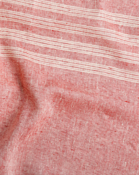 May Meさんオリジナルデザインのリネンクロス。「今日の大人服」に掲載の2作品にも使用しています。細かなボーダーでできた約18cm幅のボーダーが、全体に3本入っています。リトアニアで織られた上質なリネンの風合いと、May Meさんこだわりの色柄をお楽しみください。