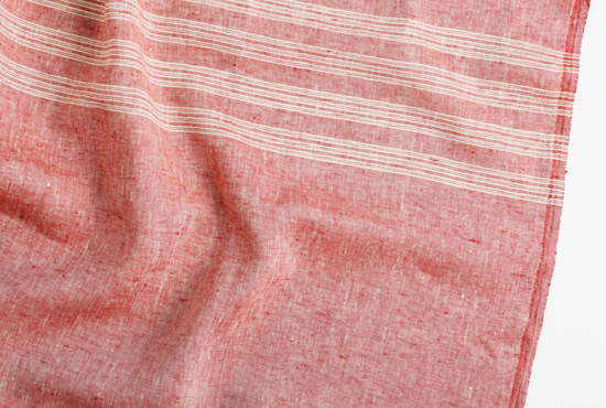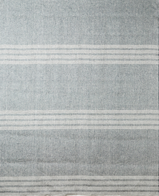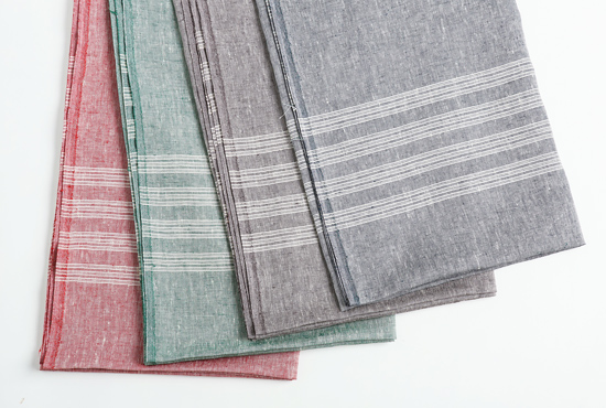 May Meさんオリジナルデザインのリネンクロス。「今日の大人服」に掲載の2作品にも使用しています。細かなボーダーでできた約18cm幅のボーダーが、全体に3本入っています。リトアニアで織られた上質なリネンの風合いと、May Meさんこだわりの色柄をお楽しみください。