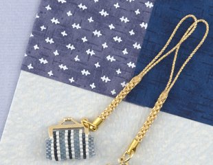 【キット作り方つき】徳島伝統「阿波藍すくも」で色づけした、独特のビーズで作るがまぐち根付。天然藍のニュアンスある色調が上品です。モダンな柄をご用意しました。