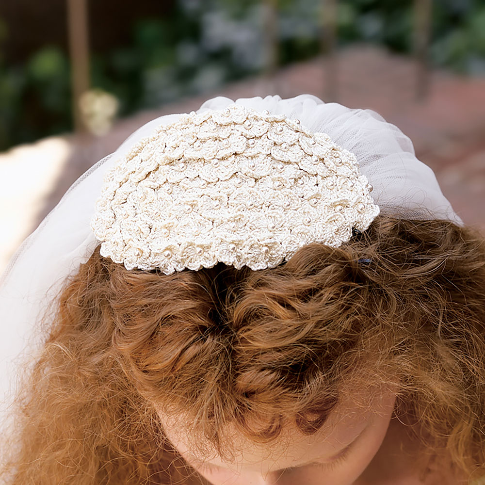 さまざまな編み地を豊かに組み合わせて、ゴージャスに仕上げたセットアップドレス。セパレートだから編みやすく、着やすいのも嬉しいところ。幾重にも重なる幸せのように、ヘッドドレスは小さなモチーフのブレードをたっぷり重ねて。 ※このレシピは3点セットのうち、ヘッドドレスのみのレシピです。