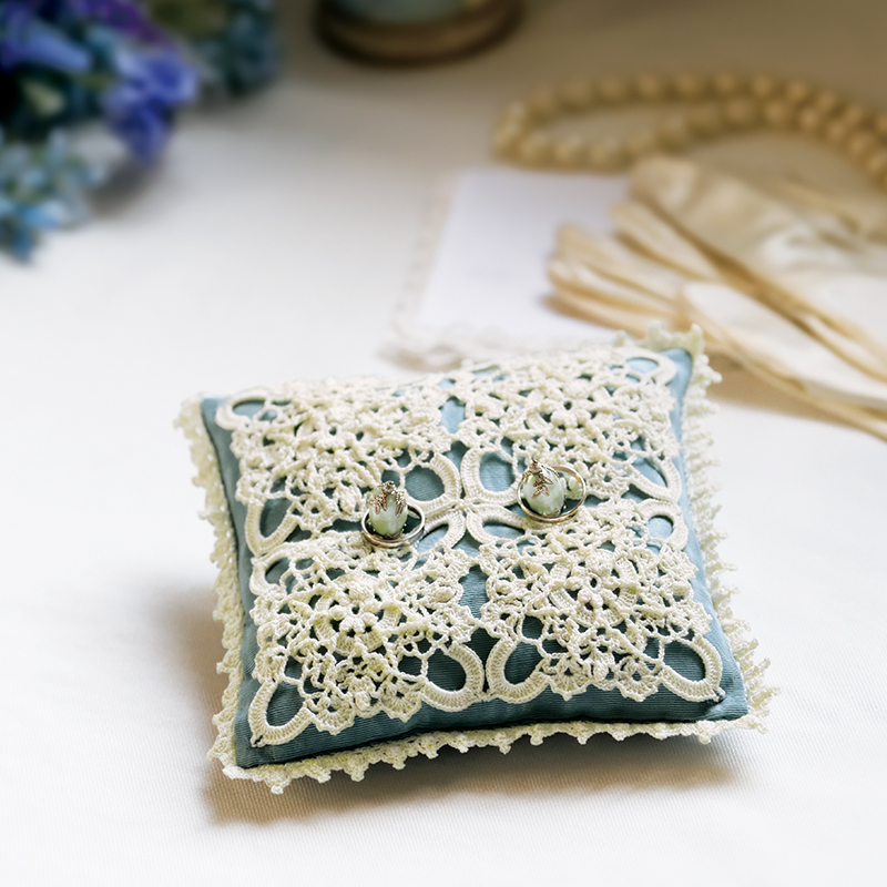 忙しい花嫁さんでも、このくらいならチャレンジできそう? リングピローは贈り物としても人気のアイテムです。繊細なモチーフを4枚つなぎ、まわりにブレードをあしらいます。クラシカルなムードが漂うリングピローは、リングボーイがうやうやしく運ぶ姿も良く似合いそう。