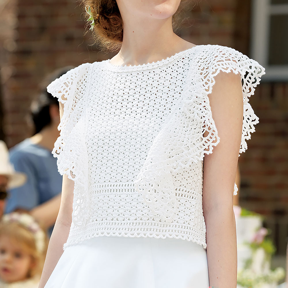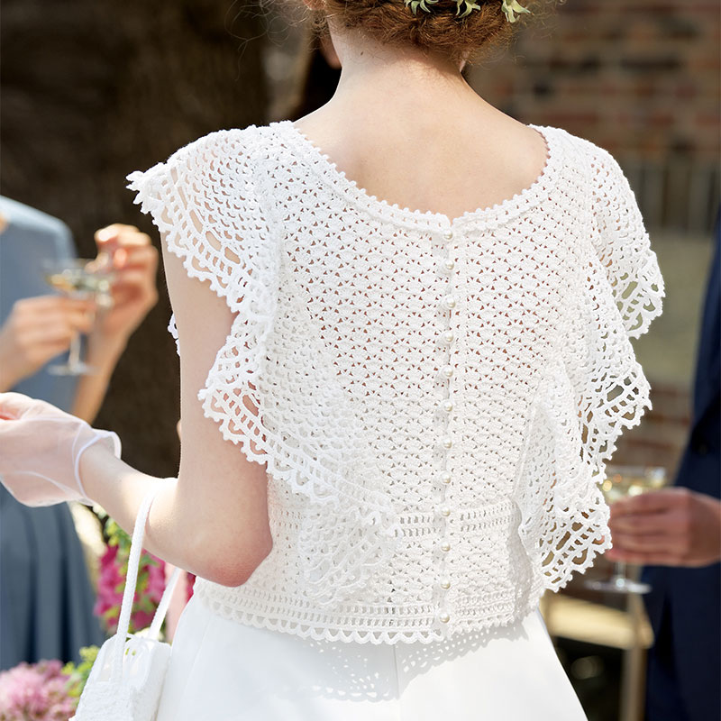 美しいプリンセスラインのシルエット、レース模様のたっぷりしたラッフルが軽やかに揺れ動く、ロマンティックウェディングにぴったりのビスチェ。ブレードがアクセントになり、編み地に変化を与えてくれます。後ろあきにはパールボタンを並べて愛らしく。