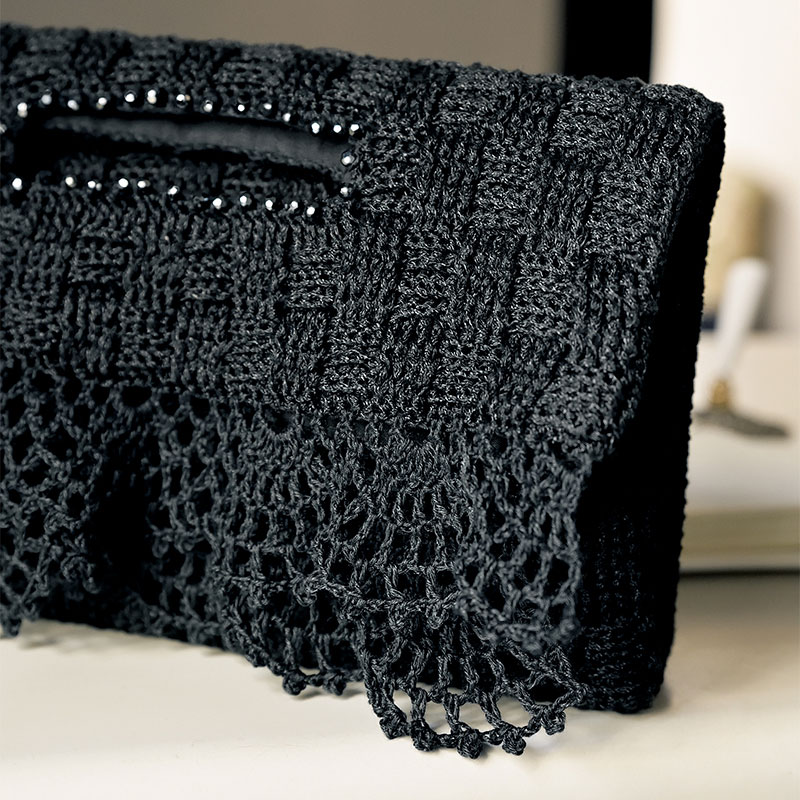 材料:ダイヤモンド毛糸 ダイヤミオ 黒(810)150g/6玉。リネンシルク 黒(7110)15g/1玉。4mm のビーズ( 黒)32 個。内袋用布(62cm×56cm)1枚。接着芯(31cm×56cm)1枚。底板(25cm×4cm)1枚。直径22mm の縫いつけマグネットホック(黒)2 組。