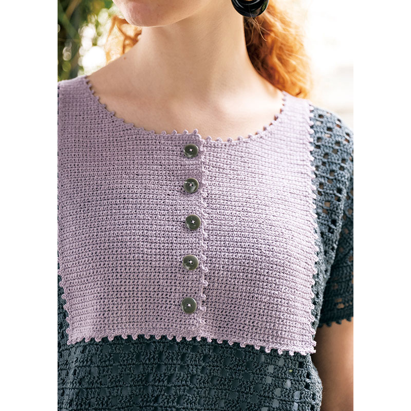 今年のトレンドでもある、ウエストマークタイプのチュニック。細編みで密に編んだパステルトーンのヨーク部分とベースの透け感が対照的で美しく、クロッシェの面白さを感じさせてくれるデザインです。身頃はまっすぐ編んでいるので、脇スリットを入れて着やすく仕上げています。