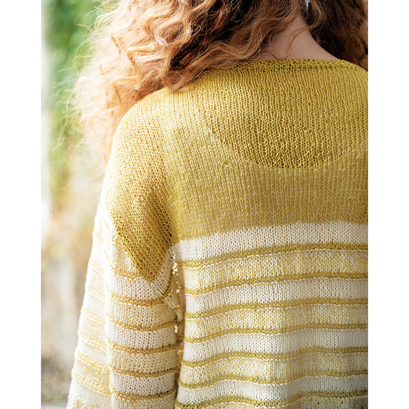 冷房の効いた車内やオフィスでの寒さ対策に、気軽に使えて大活躍! 薄手の七分袖カーディガンは、ナチュラルカラーのボーダー模様。太細2タイプの同色糸と白糸を巧みに組み合わせた配色は、知れば知るほどワクワク。いろいろな色の組み合わせを試してみたくなる配色術です。