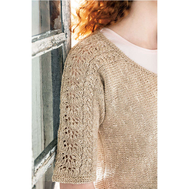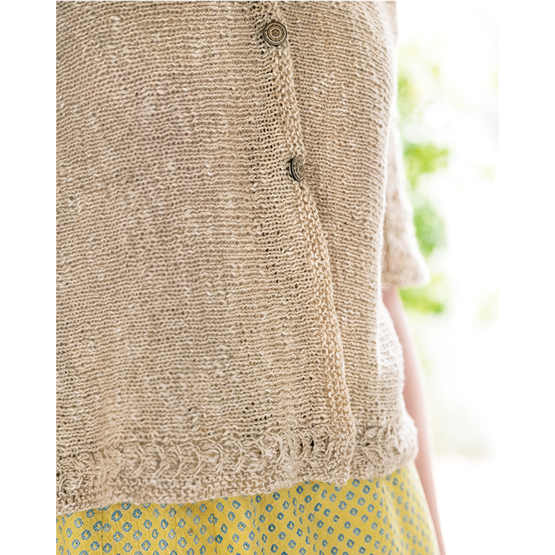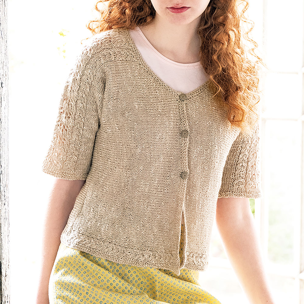 身頃から袖へと続くレーシーな模様が美しい、横編みのカーディガン。袖つけがないので見た目よりも簡単に編み上がり、始末の手間も省けて一石二鳥。編み方向を変えることで、裾に配したケーブル模様がいつもと違う表情になり、目新しい雰囲気に。