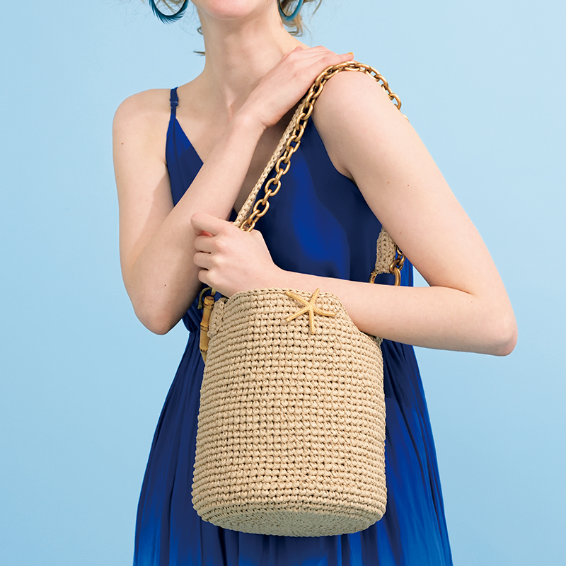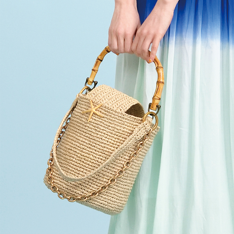 おしゃれなクラッチバッグで有名なビヨンドザリーフの丸底タイプのかごバッグは、今夏のトレンドアイテム。肩にかけられるワンハンドルの持ち手は、編みひもと太めチェーンの二重使いでおしゃれ度アップ! バンブーハンドルに大きなフラップ、内側にポケットもついて、さらに快適な使い心地です。