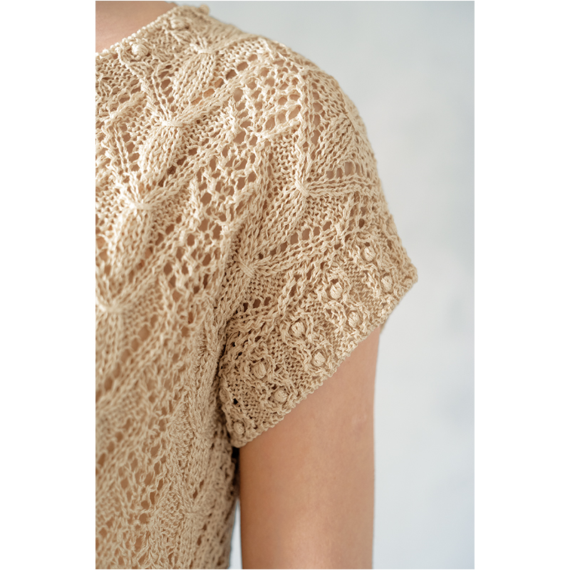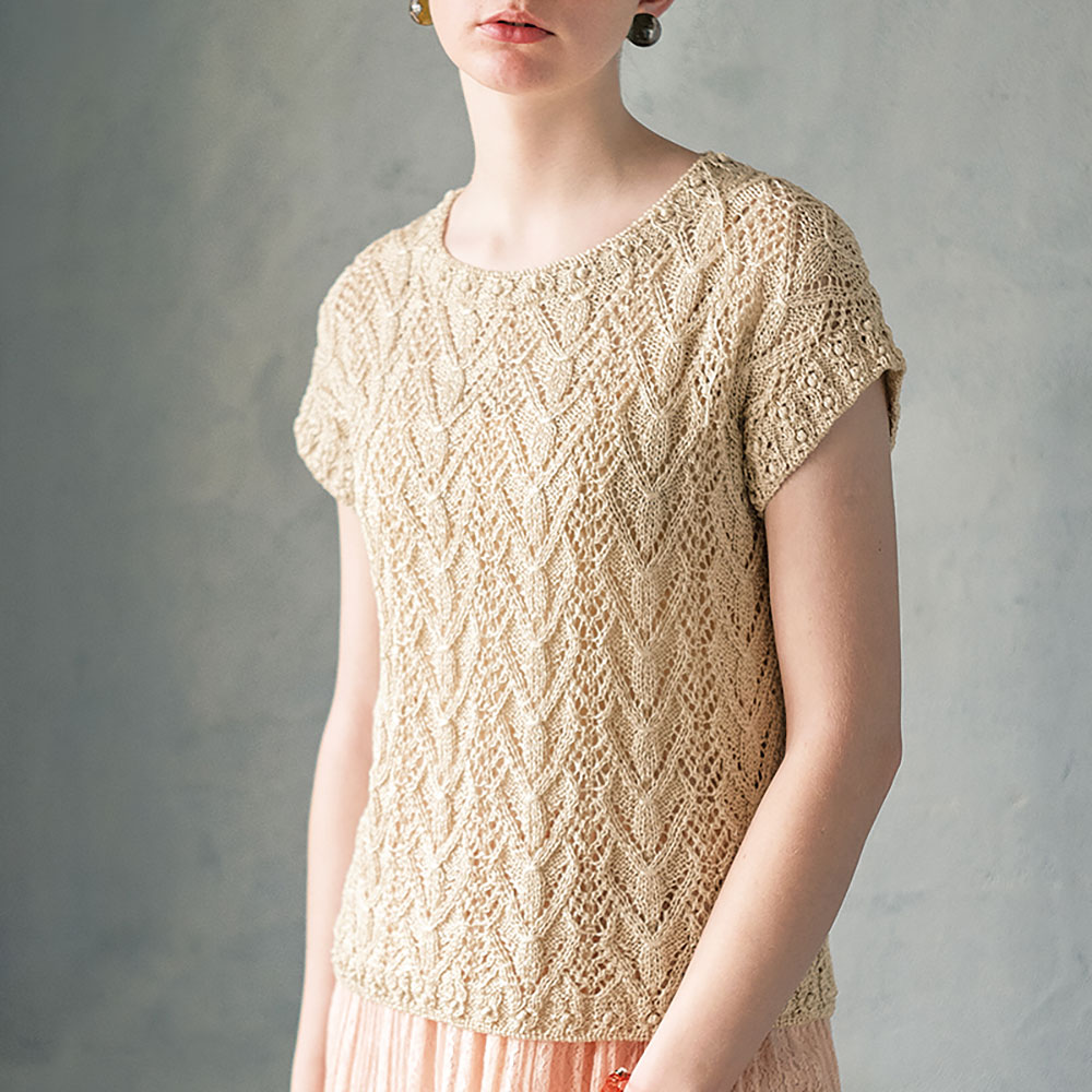 今回は1999年秋に出版された「クチュール・ニット4」の中から、モスグリーンのベーシックなVネックプルオーバーを選び、がらりと雰囲気を変えて夏の暑い日でもOKなプルオーバーにアレンジしてみました。