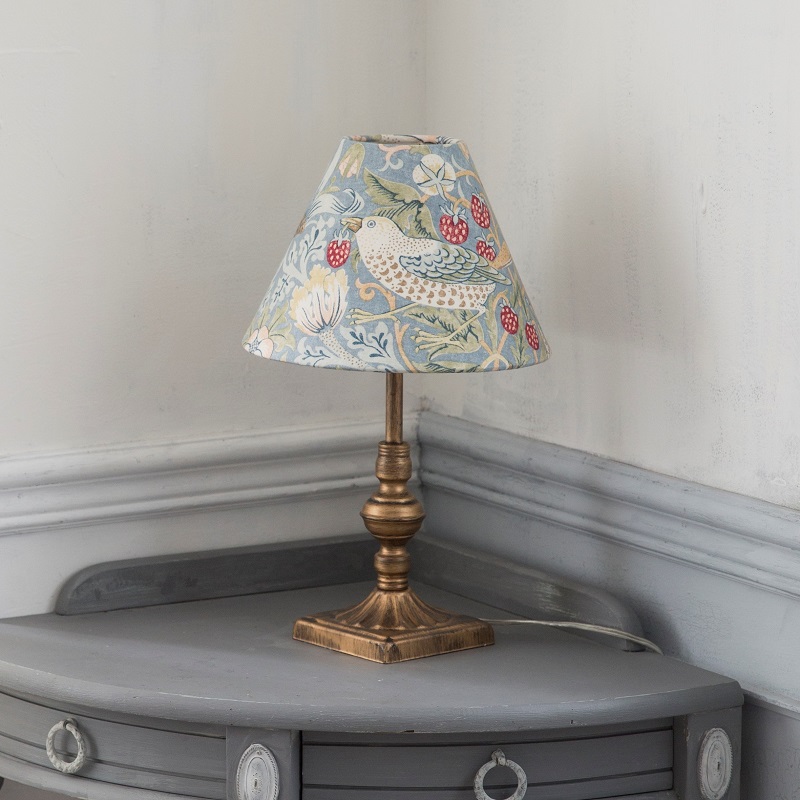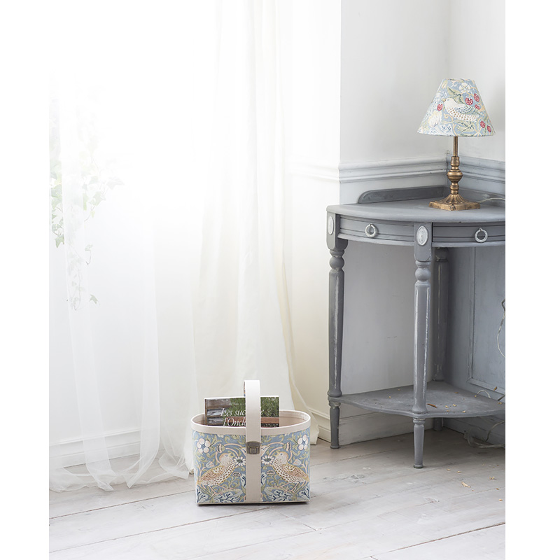 ウィリアム・モリスの数多いデザインの中でも不動の人気を誇る「ストロベリーシーフ=いちご泥棒」のインテリアファブリックを使用。