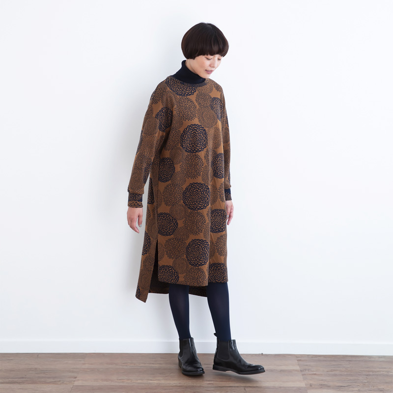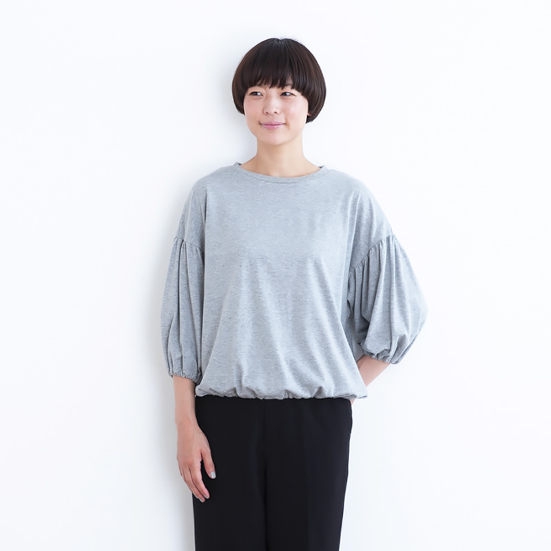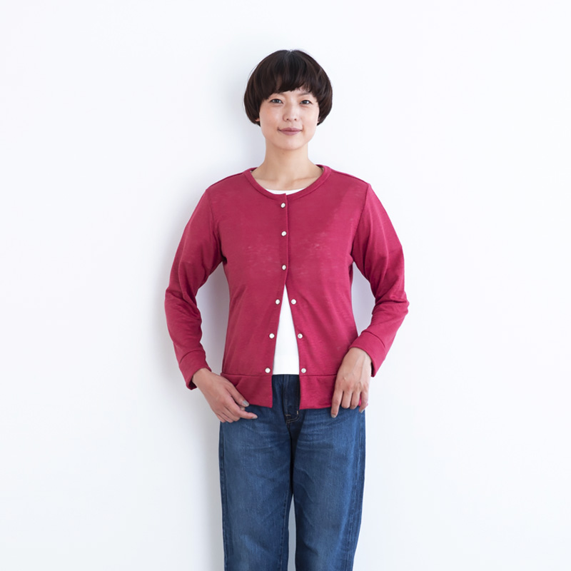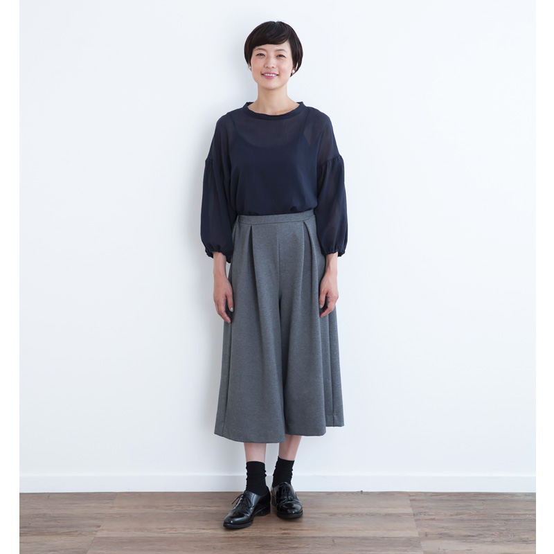 作れる作品は、基本のプルオーバーからカーディガン、ワンピースも含むトップス13点と、パンツ3点の、計16点で、どれもハイセンスですてきなデザインばかり。特に上のメイン写真のプルオーバーは、体の線を拾いにくい地厚な天竺ニットを使用しており、どなたにも似合う生成り×ネイビーのボーダー柄。詰まり過ぎず・開きすぎずのきれいなボートネックで、後ろ身頃の裾が長めにしてあるので、安心感がある着心地です。この作品に必要な材料をセットにしてお届けするので、届いたその日から作り始めることができます。