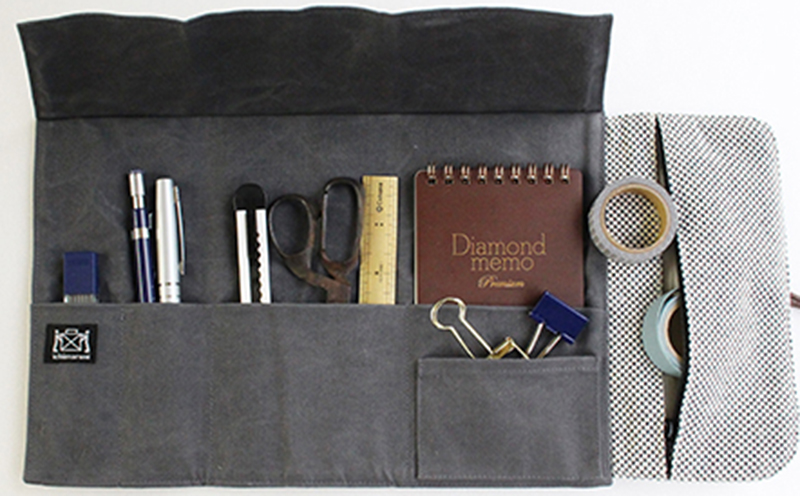 「刺し子織り」という伝統技法で織られた愛知県の三河木綿と、はっ水加工した丈夫で軽い帆布を組み合わせた道具入れです。巻き型なので持ち運びにも便利。