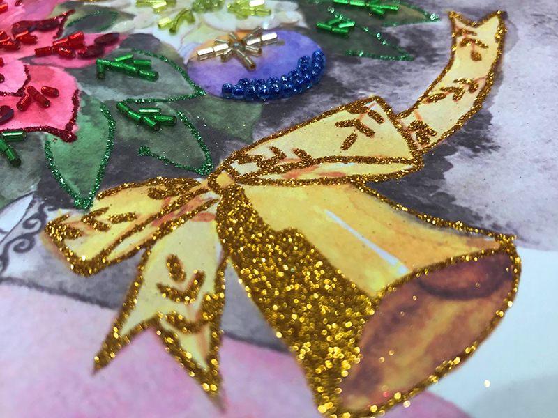 丸小ビーズ、竹ビーズ、トライアングルビーズ、ラインストーン、スパンコール、グリッター、手芸用ボンド、下絵イラスト
