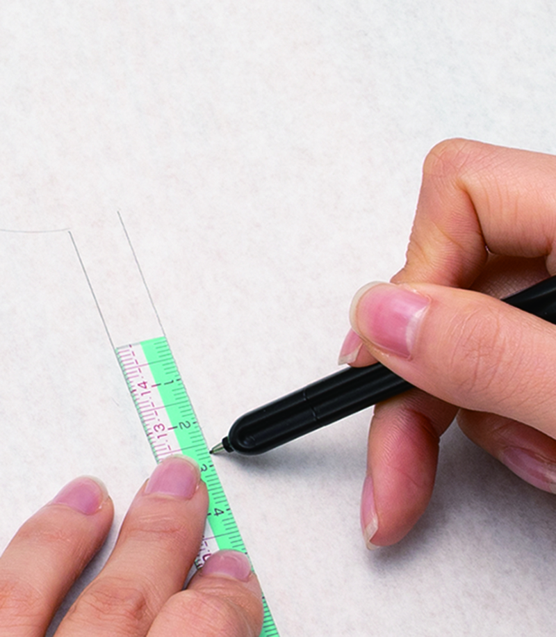 ボタンなどの製図に使える円形の穴が空いたカード型と、縫い代つけに便利な1cm幅の定規2種をセットでお届けします。パッチワークにも役立つ5mm・7mmの目盛りつき。