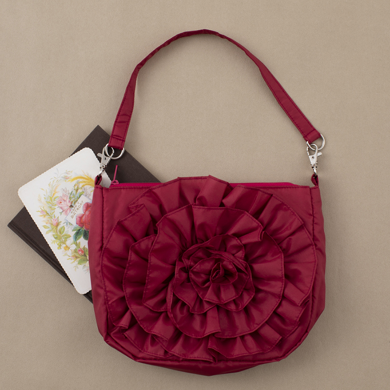 【完成品】長短2 本の持ち手がついたバッグです。手提げ・肩掛け・斜め掛けに、また持ち手なしでポーチにも。真っ赤なバラモチーフが秋の装いに映えます。内側にもポケットつき。