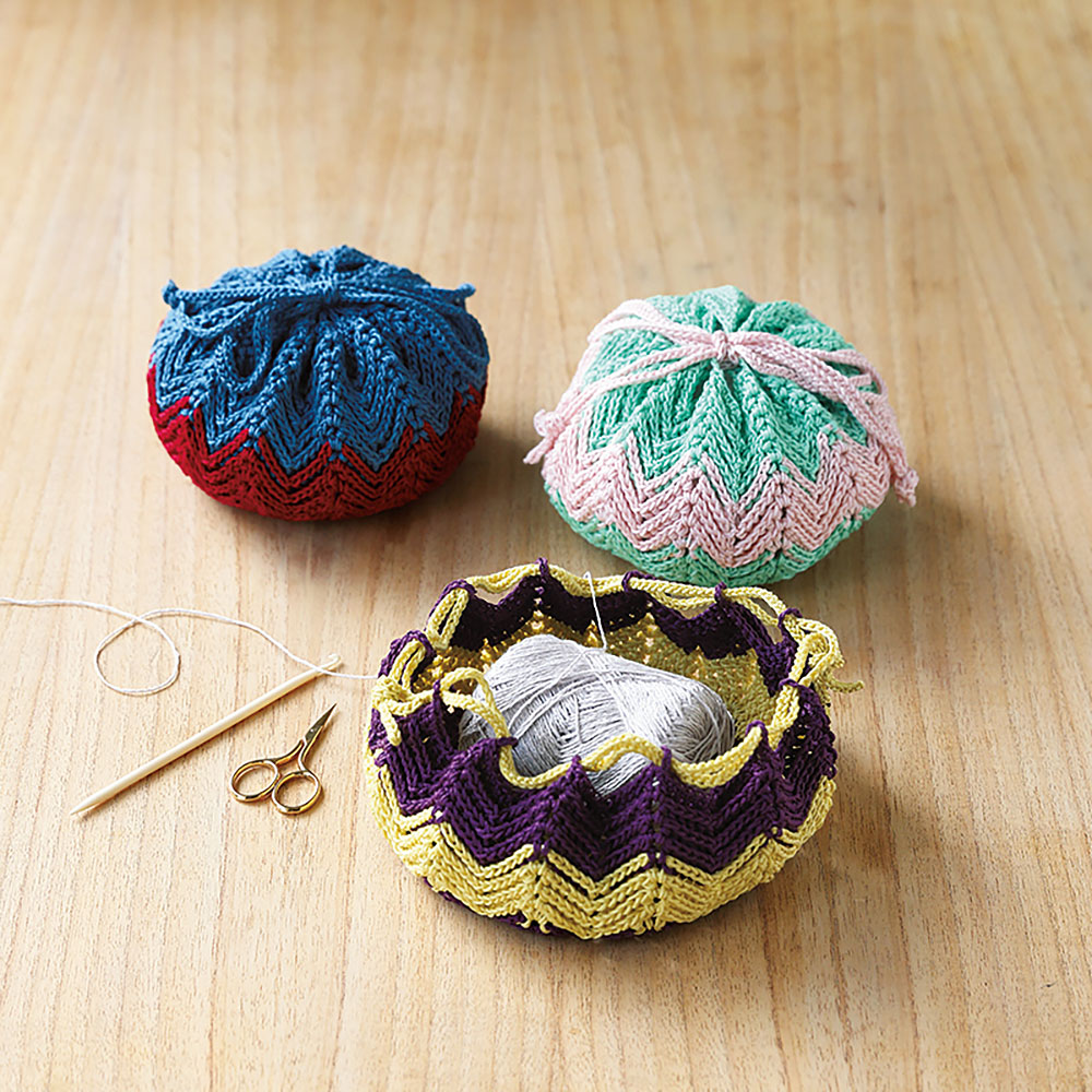 SNSで「ぼんぼり巾着」として話題の、引き上げ編みで立体感のある模様を表現した、配色を楽しむきんちゃく袋。丸々とした形も可愛く、贈り物にしても喜ばれそう。