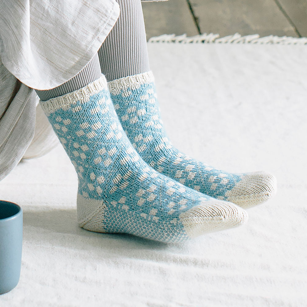 極細糸を3本どりで編んだ、暖かい靴下。おうちの中ではもちろん、靴からチラ見せしても素敵。かかととつま先は同じ編み方です。