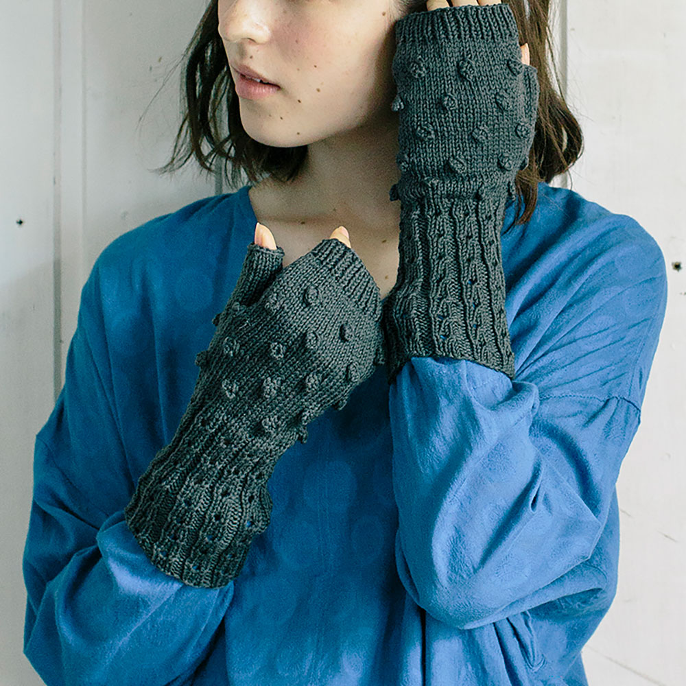 手の甲のボッブルとアイレットのリブの編み地の違いを楽しめるショート丈のアームウォーマー。スマホ派には欠かせない指先が出るデザインで、使い勝手も◎