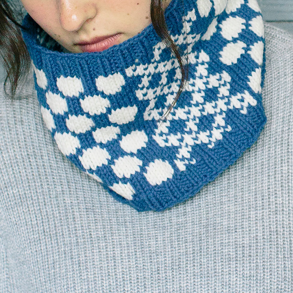 ドットとチェックの二つの柄を交互に配置したモダンな編み込み。ズボッとかぶれるスヌードは自転車や旅行など活動的なシーンに便利。2玉で気軽に編めます。