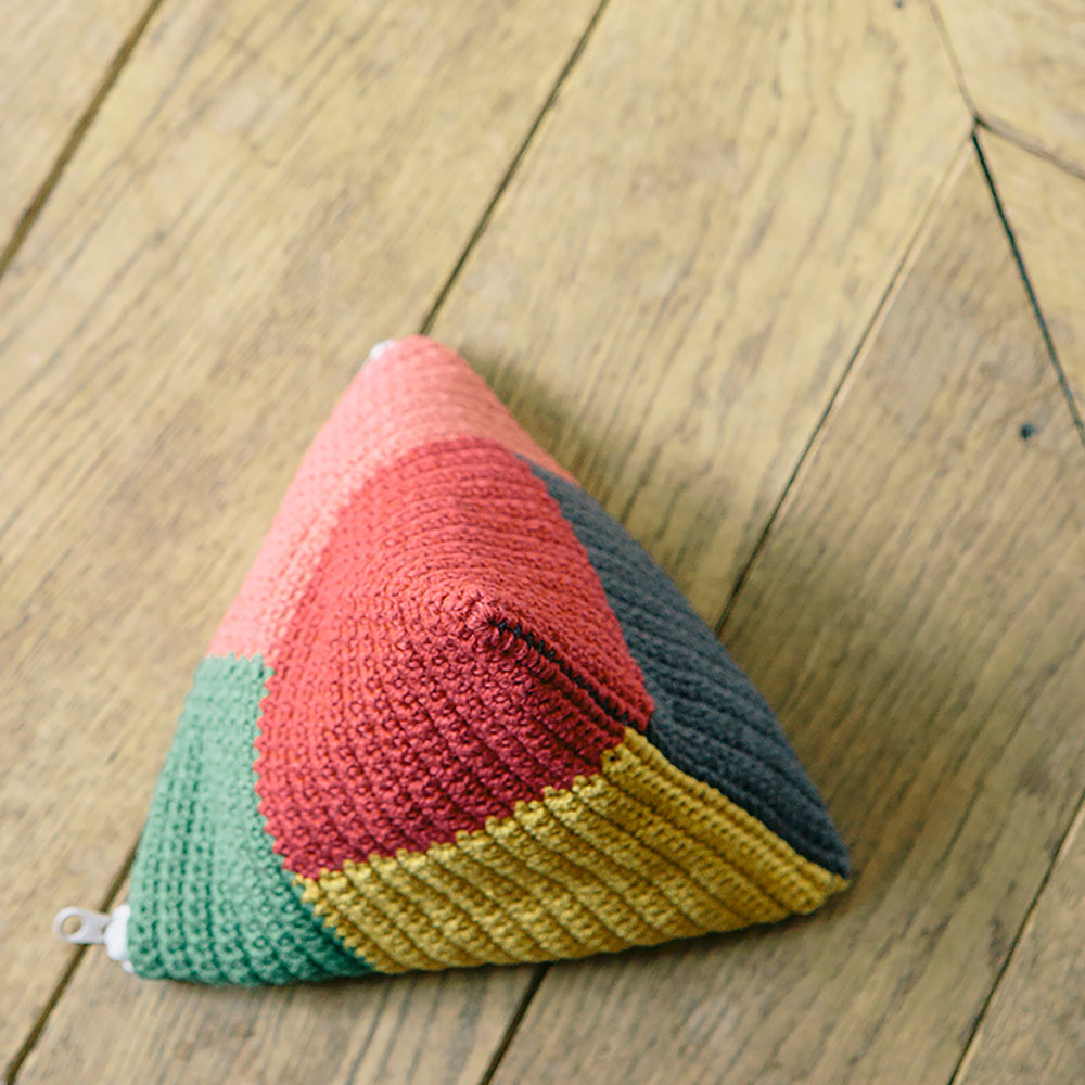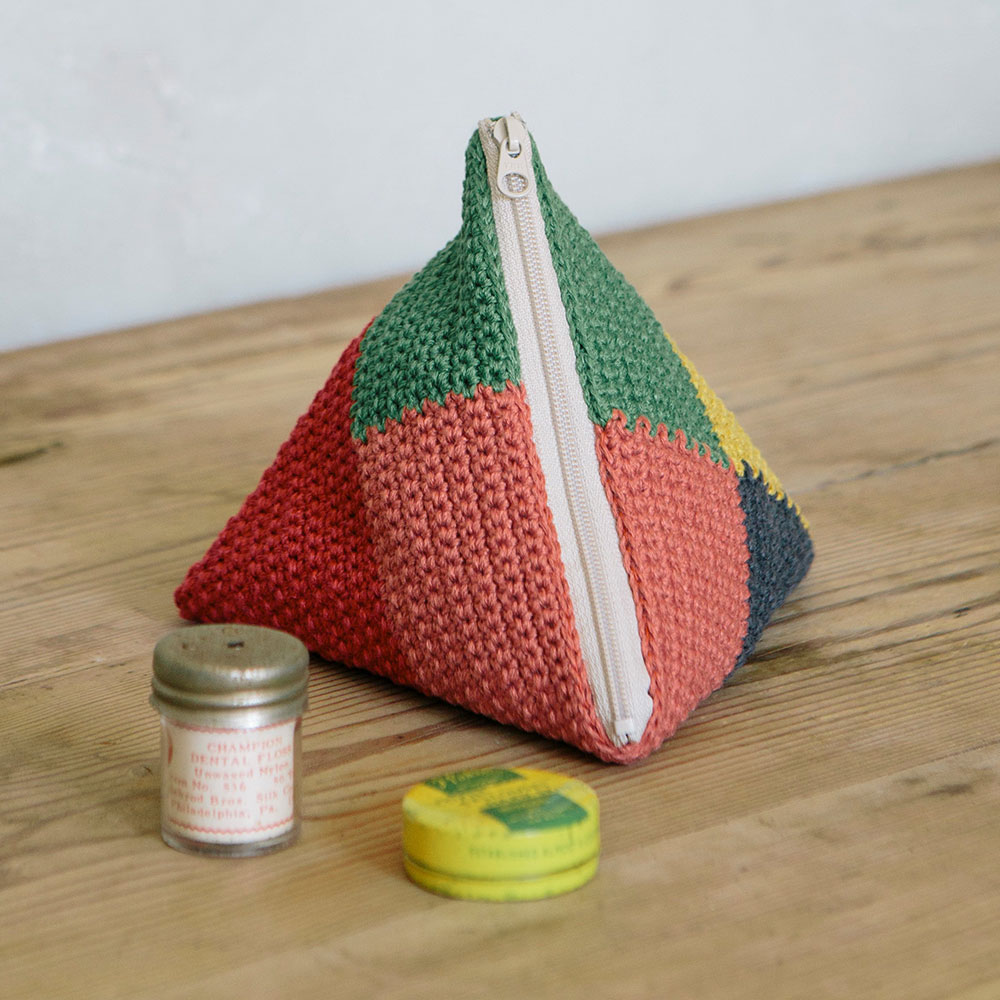 長方形の編み地を折りたたんで立体に。ファスナーつきなので細かな収納もおまかせください。5色のパッチワーク風ポーチは雑貨っぽいヴィジュアルが◎
