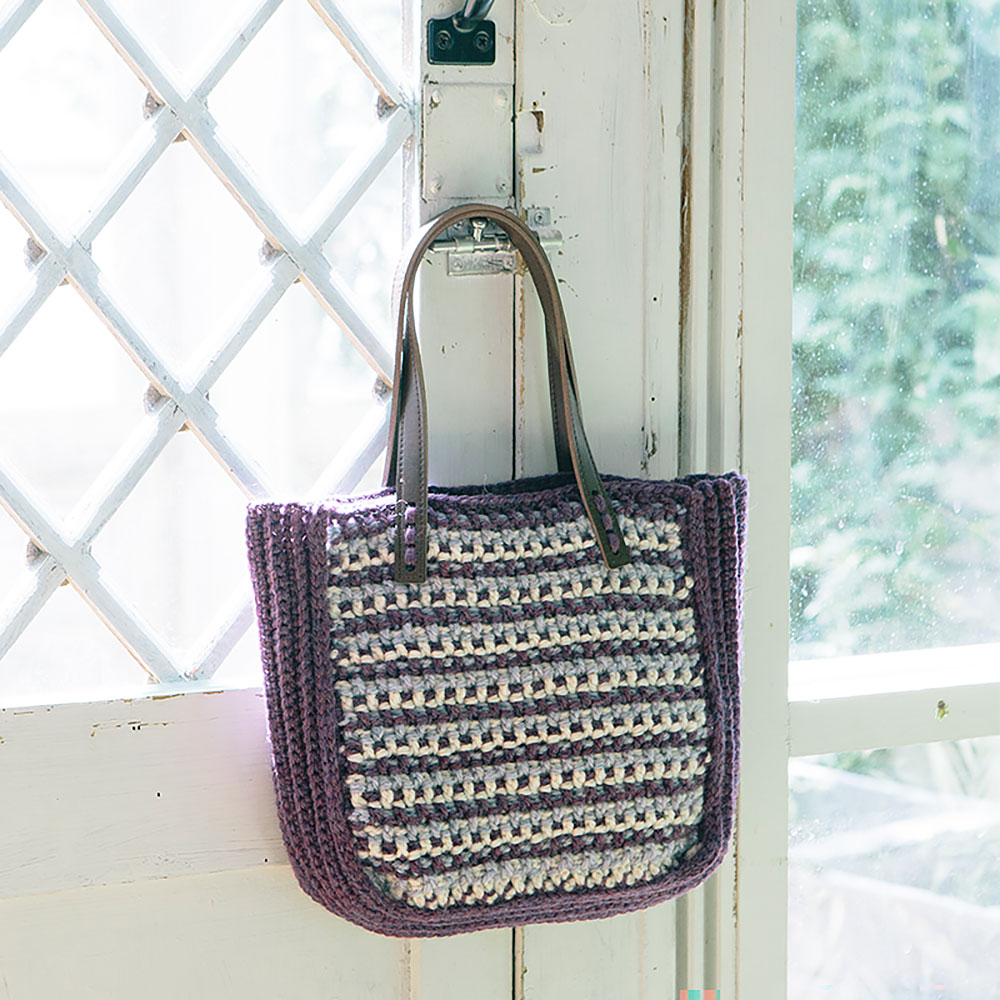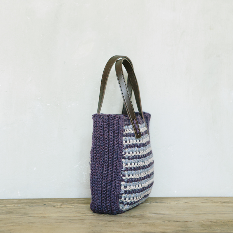ベーシックなマチつきバッグはデイリーバッグとして重宝しそう。正面の四角い編み地は引き上げ編みの縞模様。編むのが楽しいちょっぴり変わった編み方です。