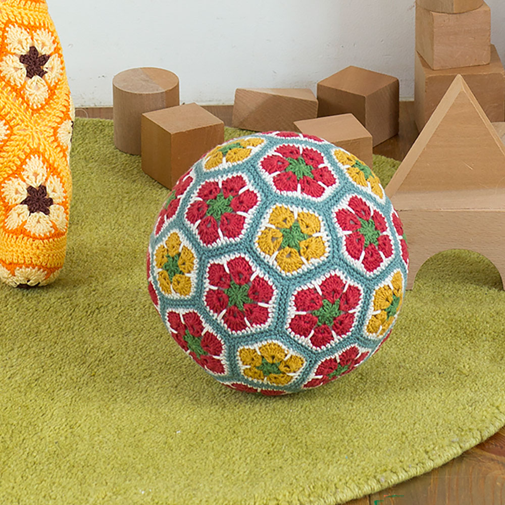 華やかでおもちゃにぴったりなまん丸ボール。こんな立体アイテムを作り出すのがアフリカンフラワーの醍醐味です。五角形と六角形を組み合わせて作ります。