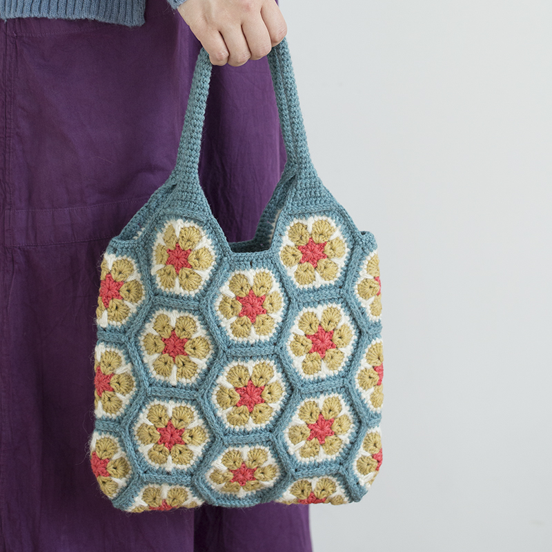 レトロカラーのモチーフでまとめたグラニーバッグ風のデザイン。持ち手は途中を輪編みにして持ちやすくしています。