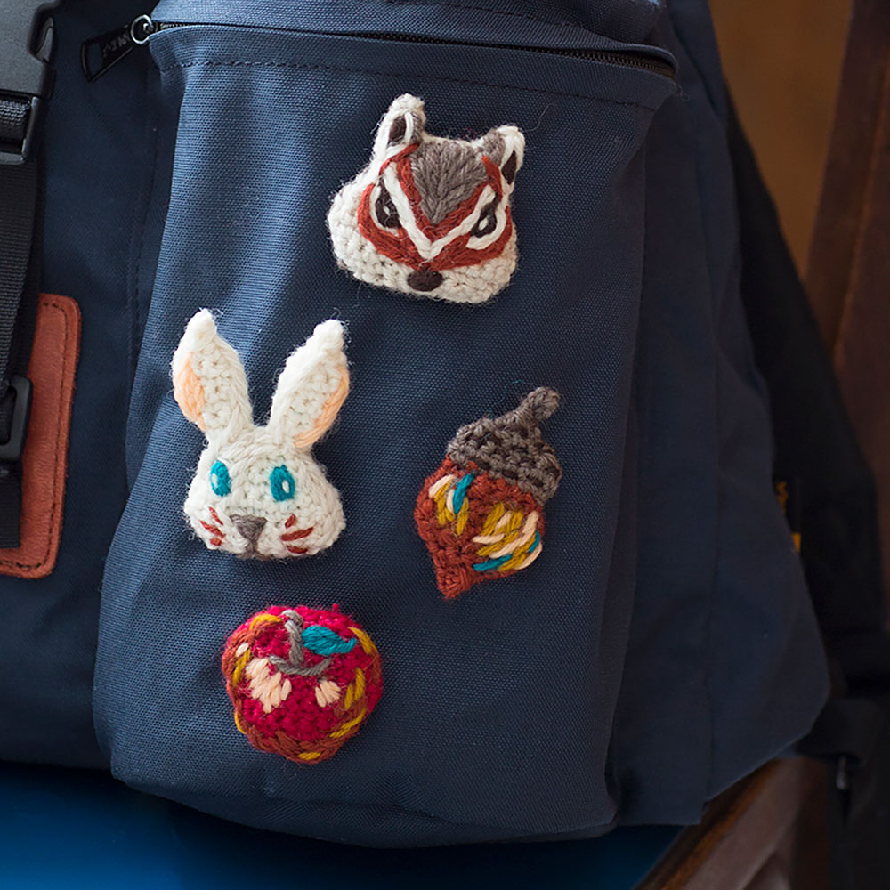 材料:共通:ブローチピン1 個 リス:リッチモア パーセント アイボリー(123)・茶色(125)各2g、生成り(1)・赤茶(77)・濃い茶(89)各少量 ウサギ:リッチモア パーセント 生成り(1)4g、アイボリー(123)・肌色(81)・青緑(34)・赤茶(77)・茶色(125)各少量りんご:リッチモア パーセント 赤(75)3g、赤茶(77)・からし色(7)・青緑(34)・肌色(81)・茶色(125)各少量どんぐり:リッチモア パーセント 赤茶(77)2g、濃い茶(89)・茶色(125)・からし色(7)・青緑(34)・肌色(81)各少量