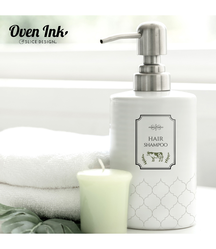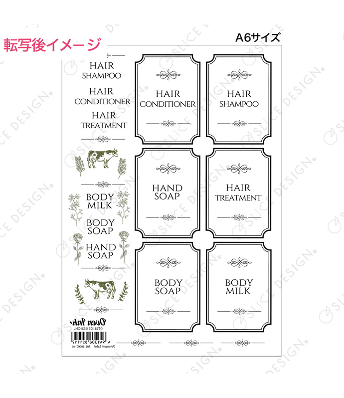石鹸や洗剤ボトルをオシャレにラベリングできる、クリーンなフォントとフレームが特徴です。