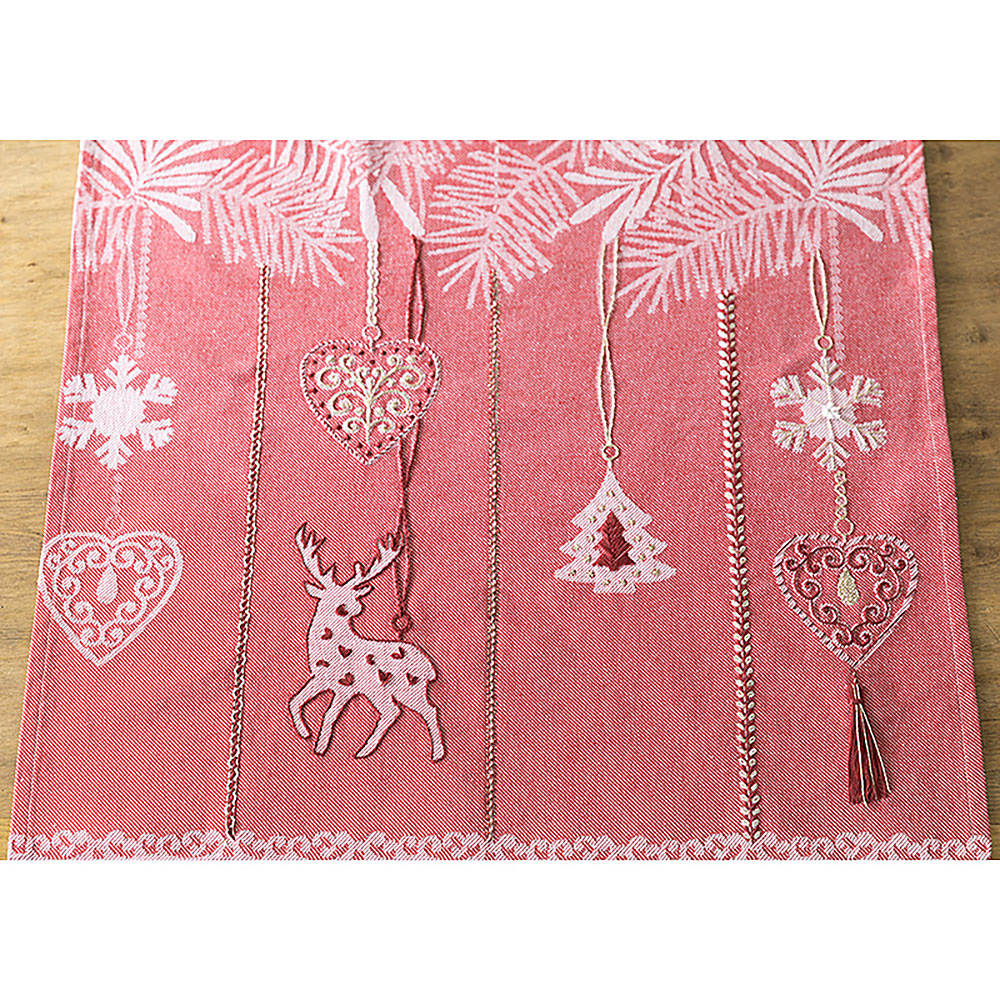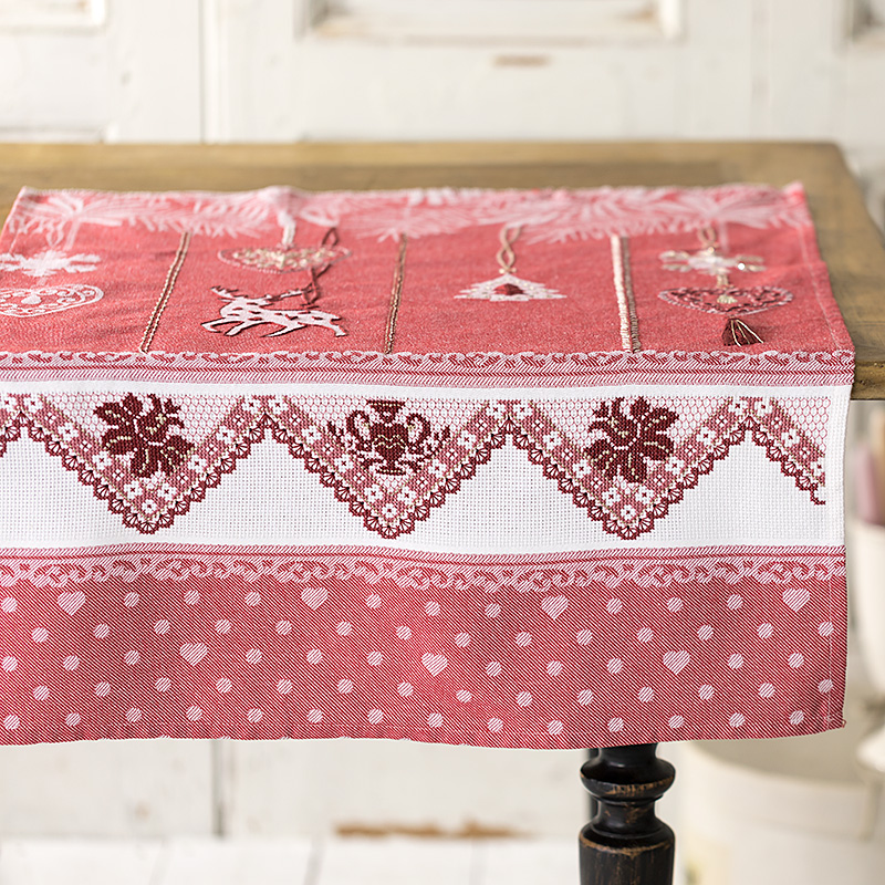 イタリア・グラツィアーノ社製のテーブルセンター。クリスマスのテーブルを彩る上質なクロスには手刺しゅうをほどこして特別感を演出。アイーダ部分にはクロスステッチを、織り模様の部分には図柄に沿って刺しゅうが楽しめます。