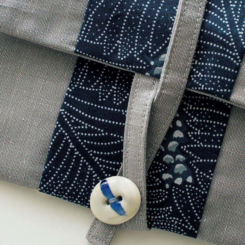 ニュアンスのあるグレーのコットンシャンブレーに、黒羽志寿子オリジナル藍の型染め風のプリント布を組み合わせたカードポーチ。オリジナルデザインの陶製ボタンがポイントになっています。